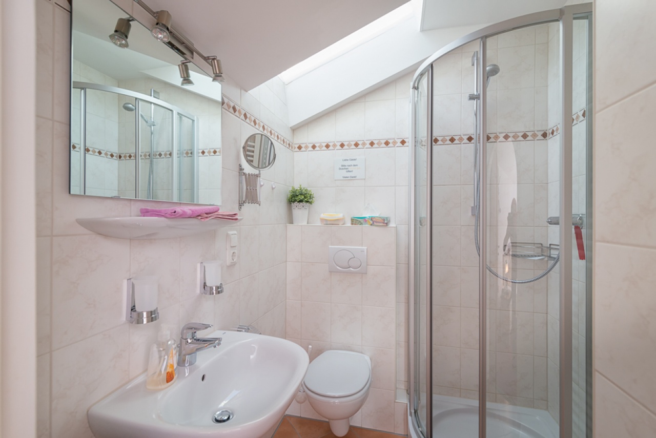 Schönes neu renoviertes Bad mit Dusche, WC, Waschbecken, Kosmetikspiegel und Fön. Hantücher werden kostenlos gestellt. Auch zum Wechseln sind genügend vorhanden!